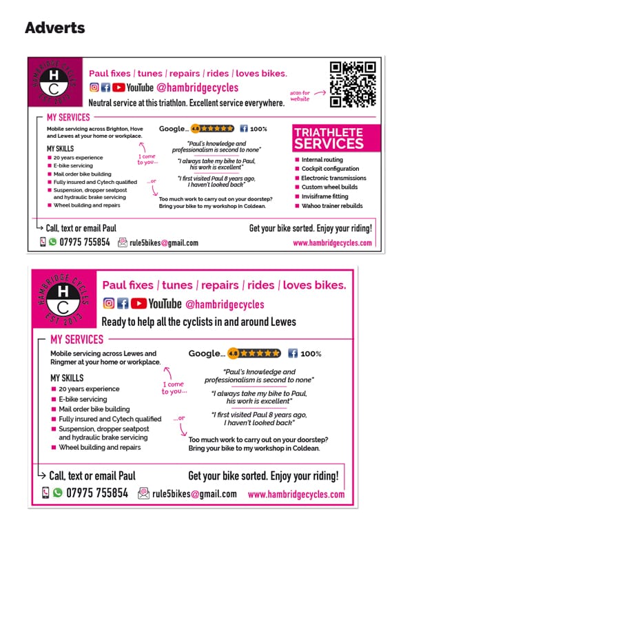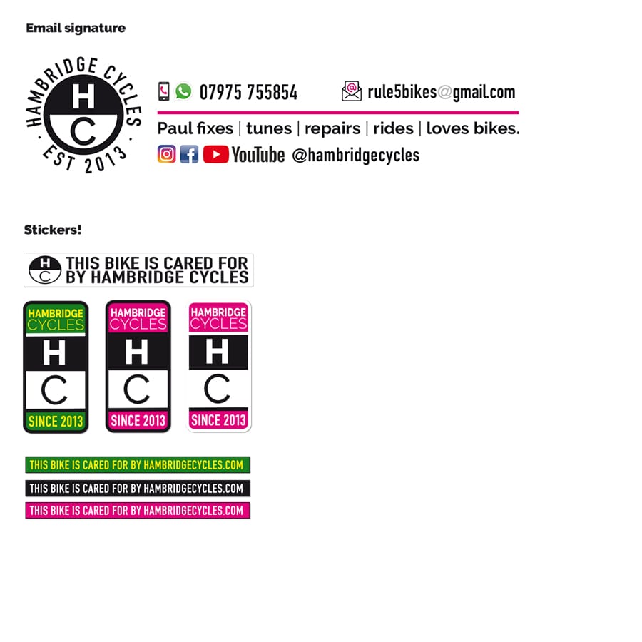 A bit of a contra-deal – design and bike-care swapsies. I worked with a friend to give him a little bit of a logo/identity/branding thing. Some graphics and colab’ed with him on the wording. All to convey his helpful, practical, realistic approach to bicycle care, builds, maintenance. Various graphics (and writing); adverts, email signature, stickers, bike livery, logo.