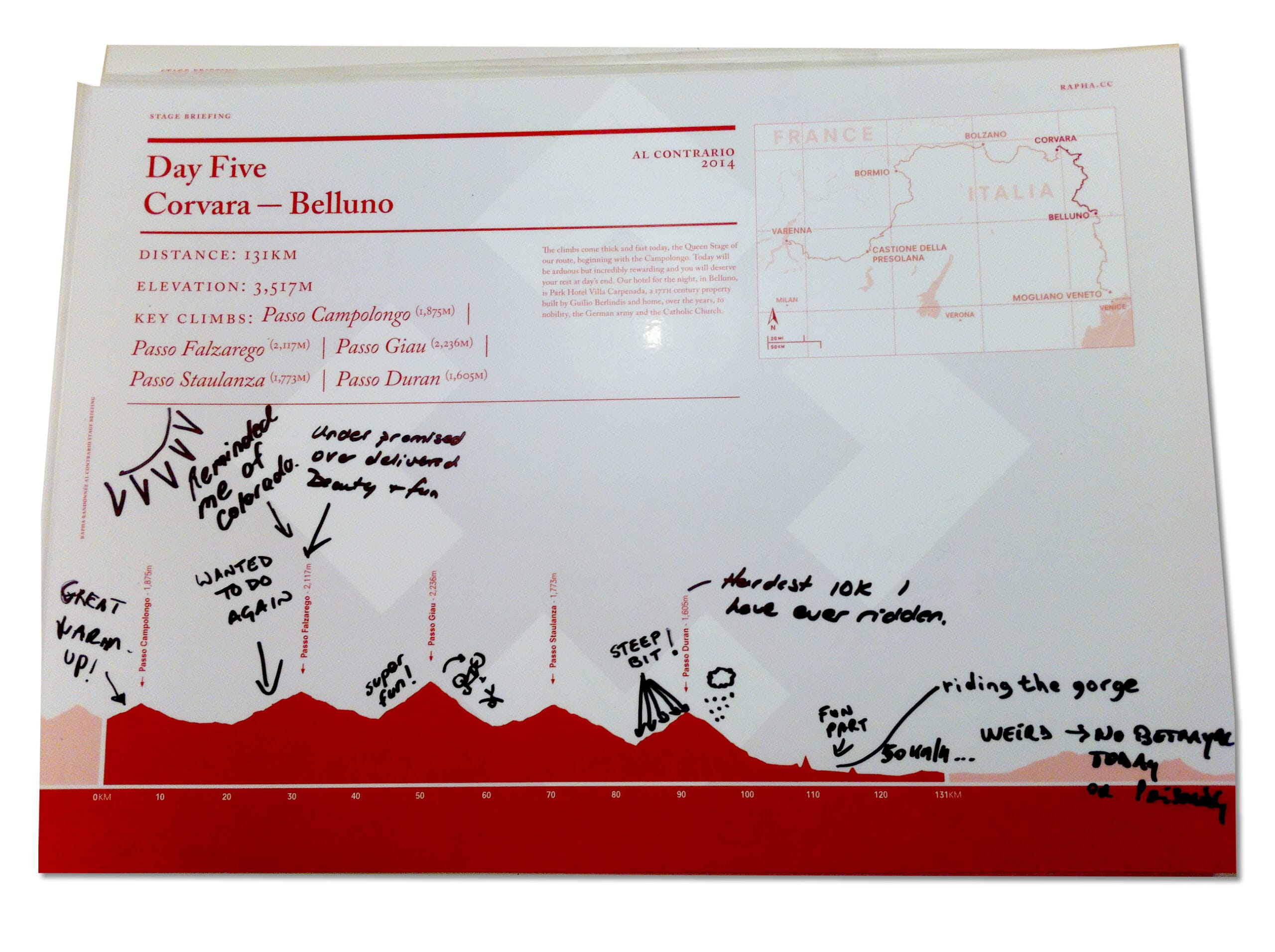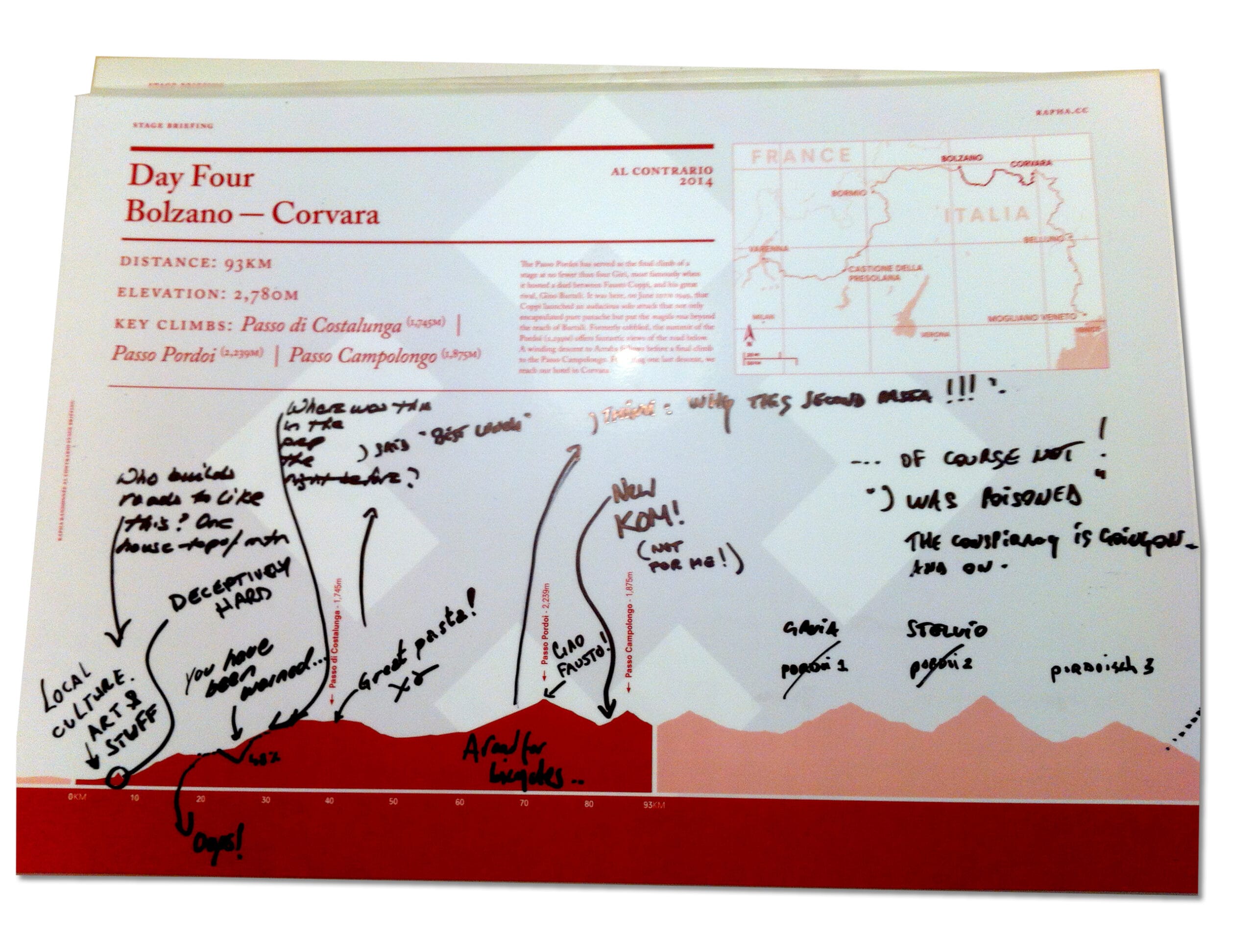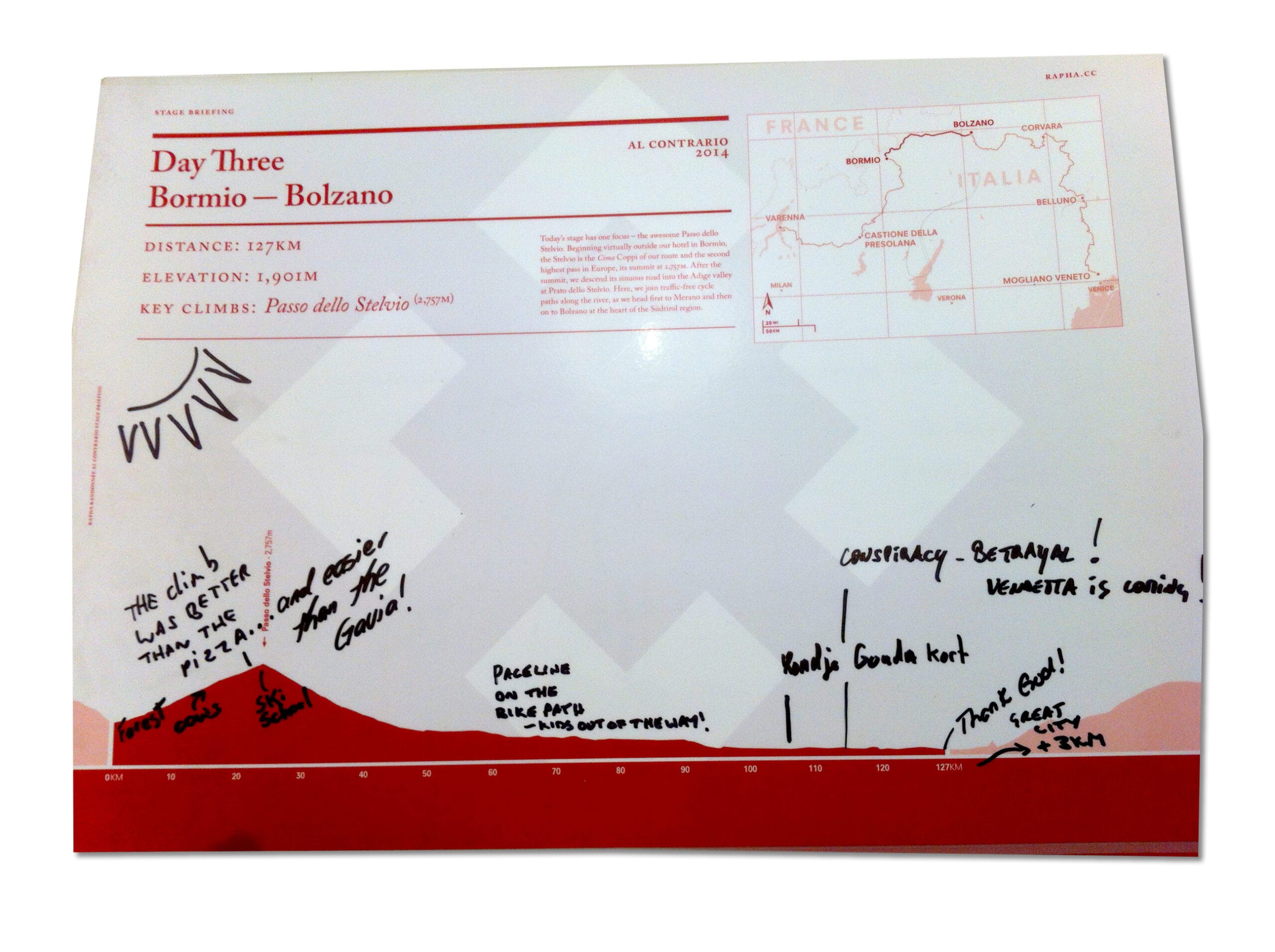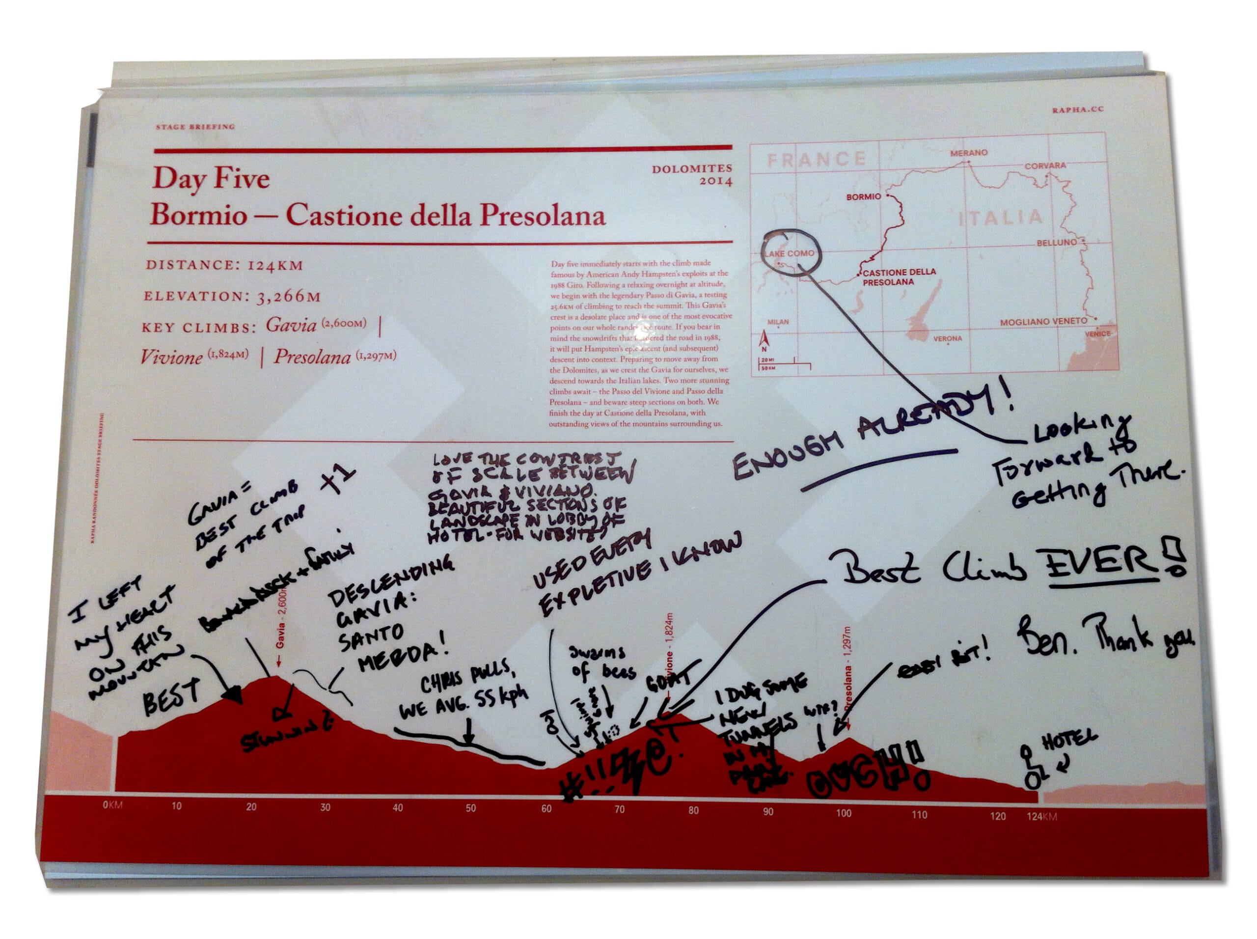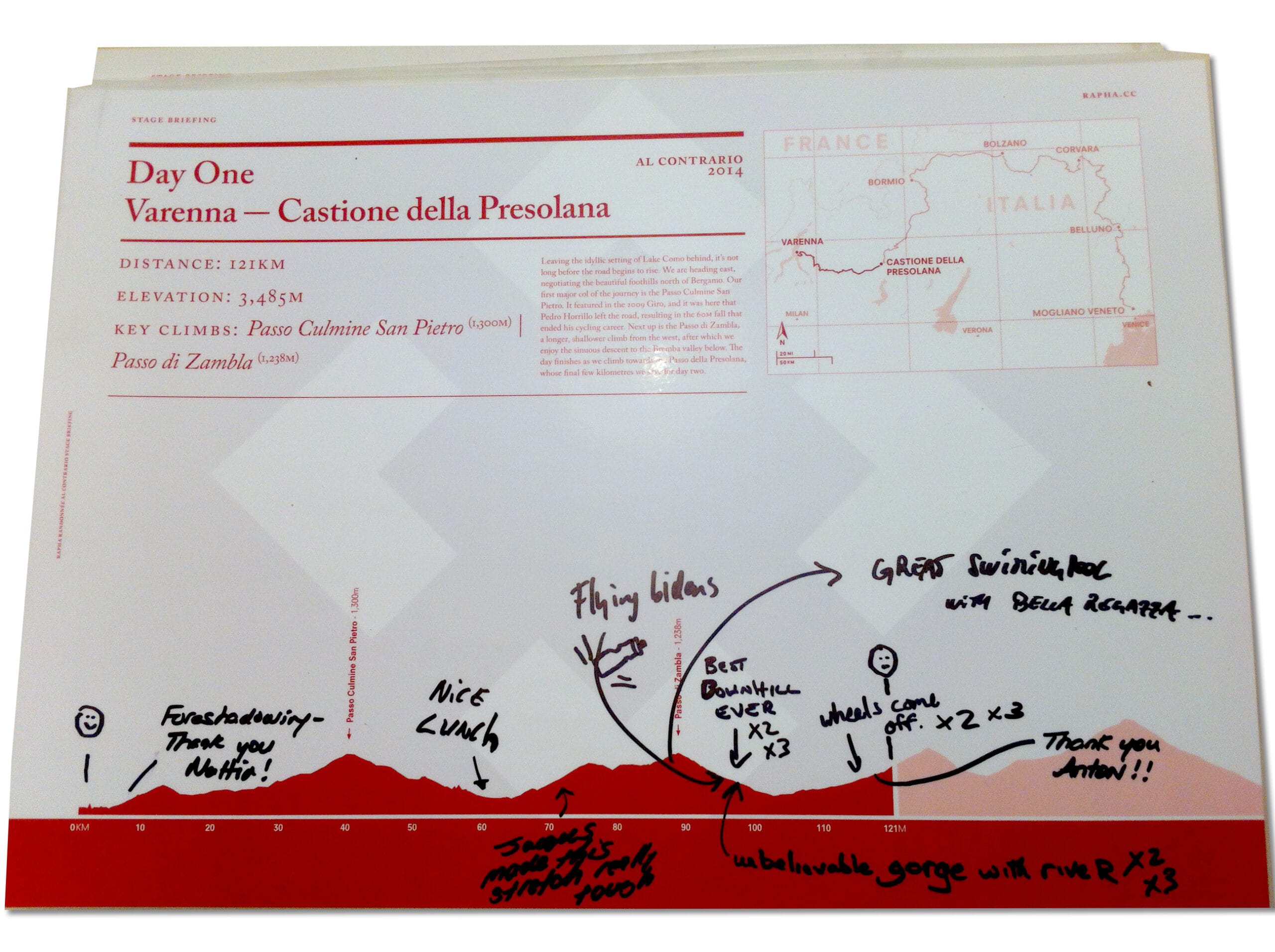 Rapha Travel was, for a few years, the most excellent cycling trips. Crafted adventures, lead by some excellent riders (and Brad heading the (united) division) and I was delighted to be tested myself with maps, ride profiles (elevations) and rider information (booklets, cue cards, top tube guides, postcards etc). Indulgent perhaps but sometimes when things are taken to extremes even epic suffering can be luxurious.