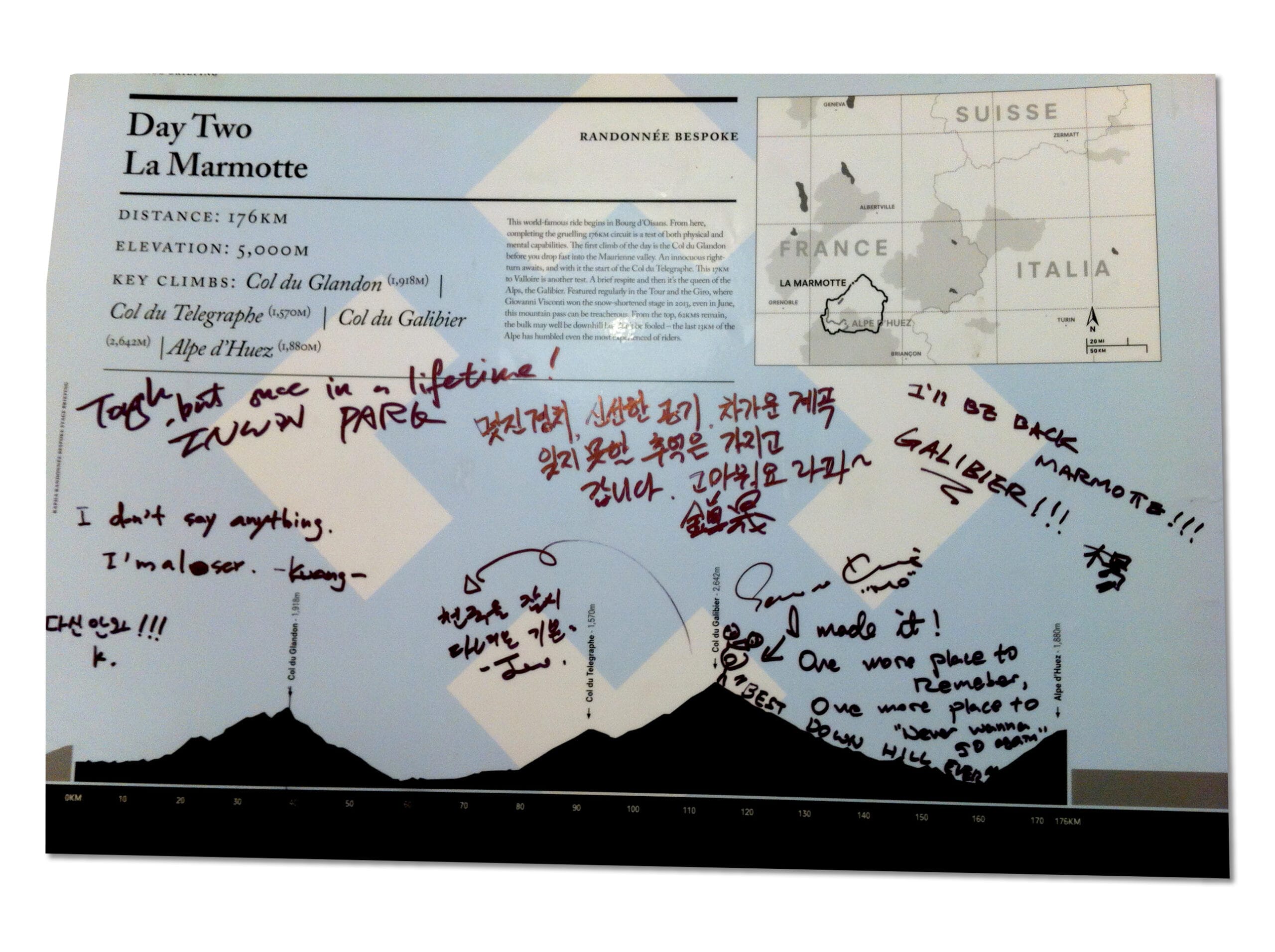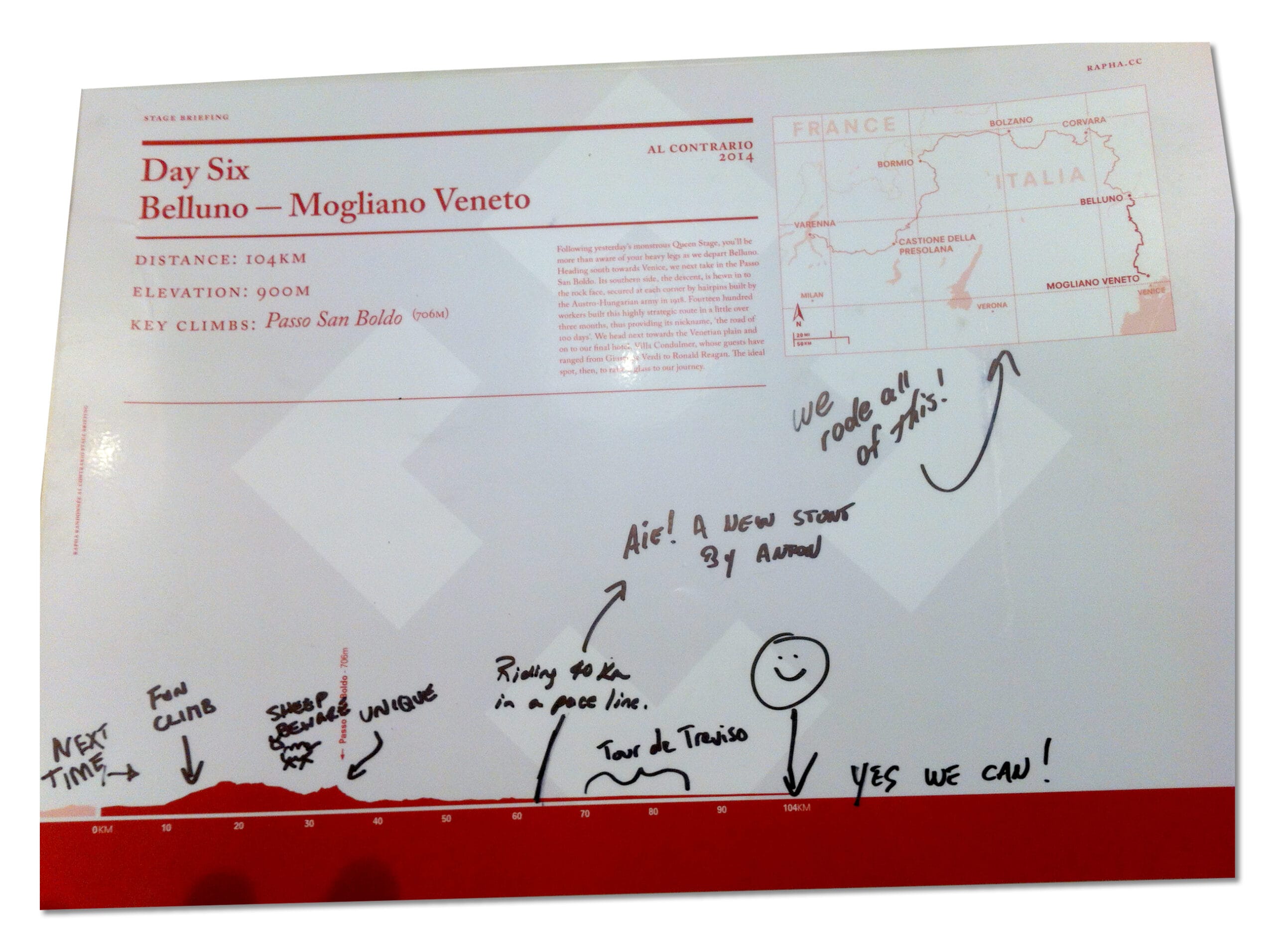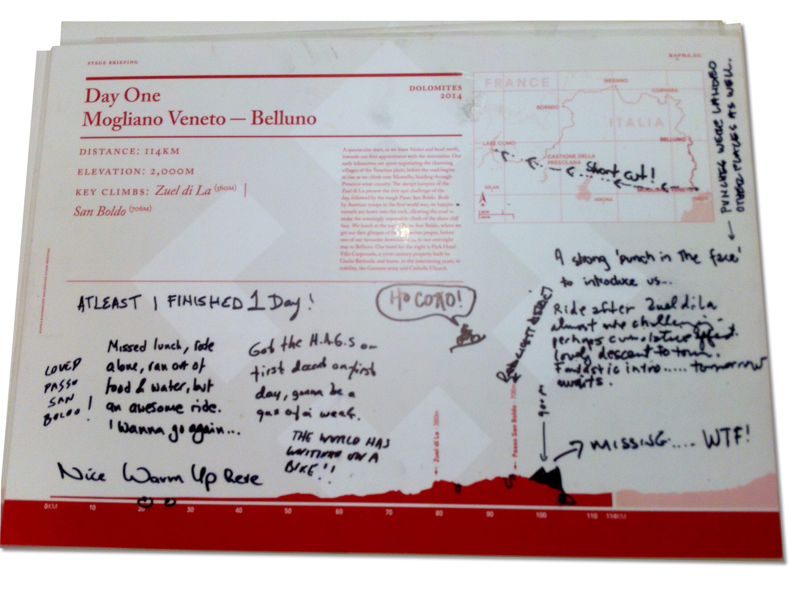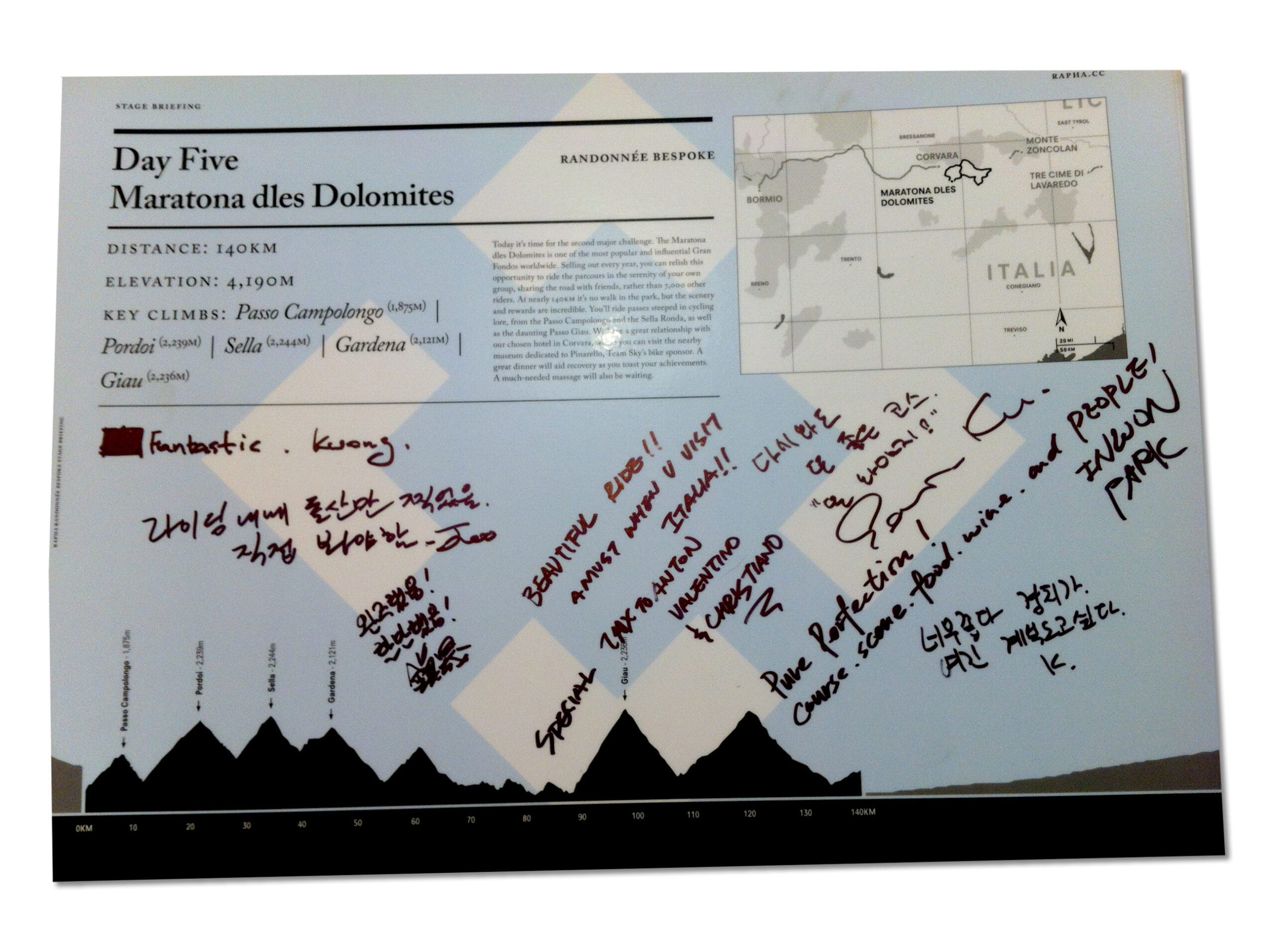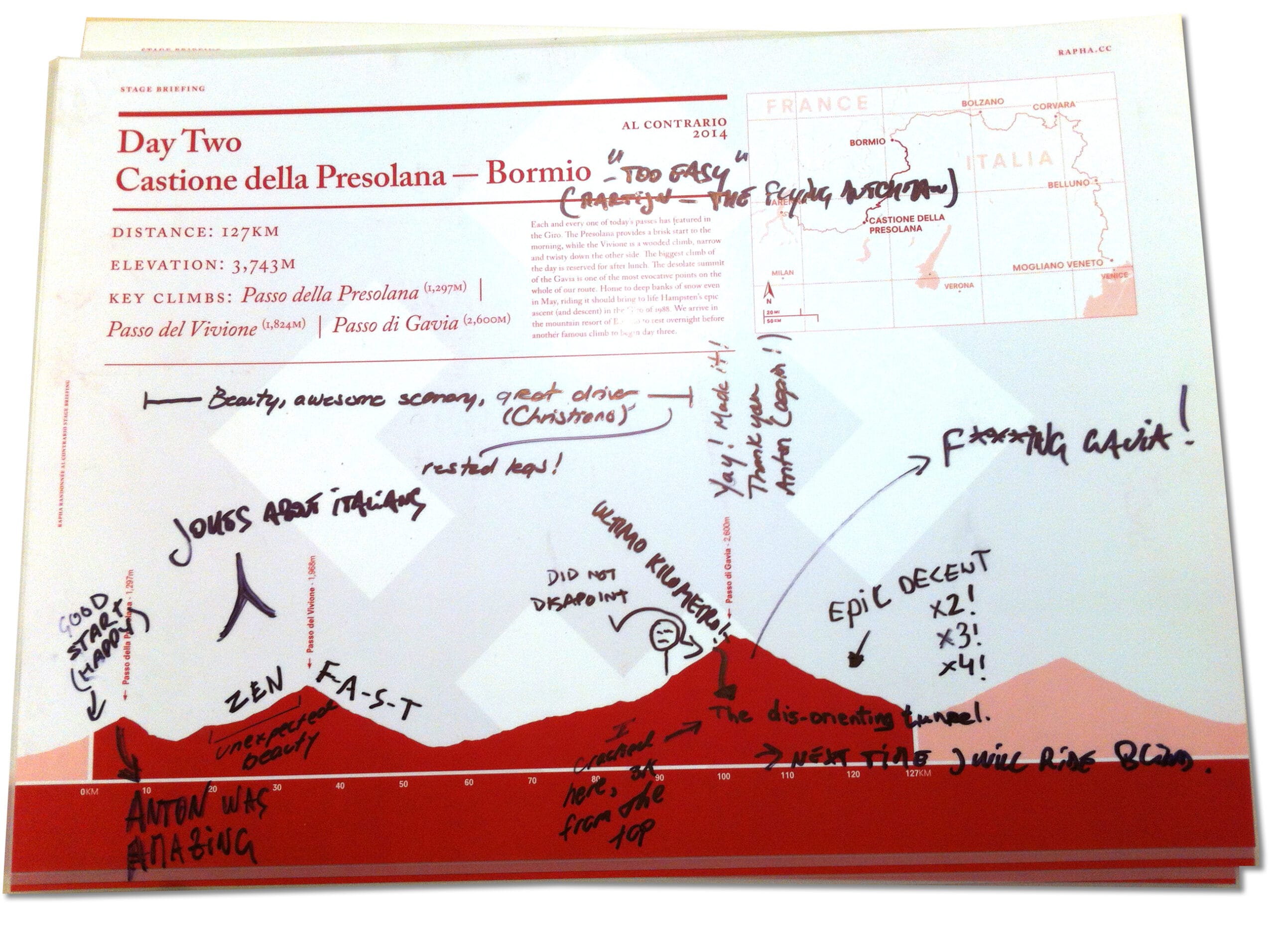 Rapha Travel was, for a few years, the most excellent cycling trips. Crafted adventures, lead by some excellent riders (and Brad heading the (united) division) and I was delighted to be tested myself with maps, ride profiles (elevations) and rider information (booklets, cue cards, top tube guides, postcards etc). Indulgent perhaps but sometimes when things are taken to extremes even epic suffering can be luxurious.